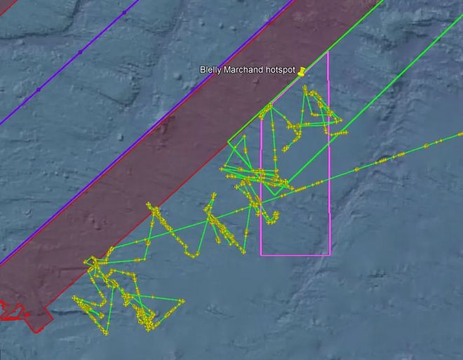3月24日,船只进入马尔尚和布莱利提名的热点区域,亮绿色线条是此前的搜寻航迹