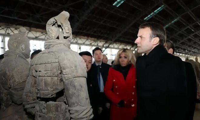 2018年1月,马克龙与妻子在位于陕西省西安市的秦始皇帝陵博物院参观。图据新华社