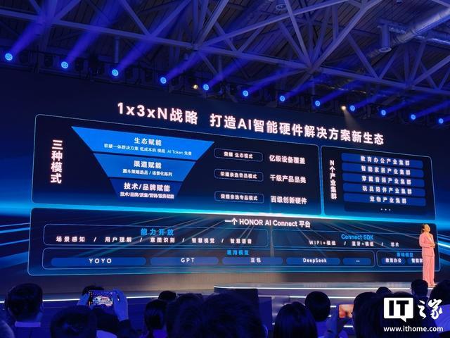 荣耀产品线总裁方飞还介绍了荣耀 AI 生态布局,提出了 1 x 3 x N 战略,一个平台,三项赋能,N 个产业集群:
